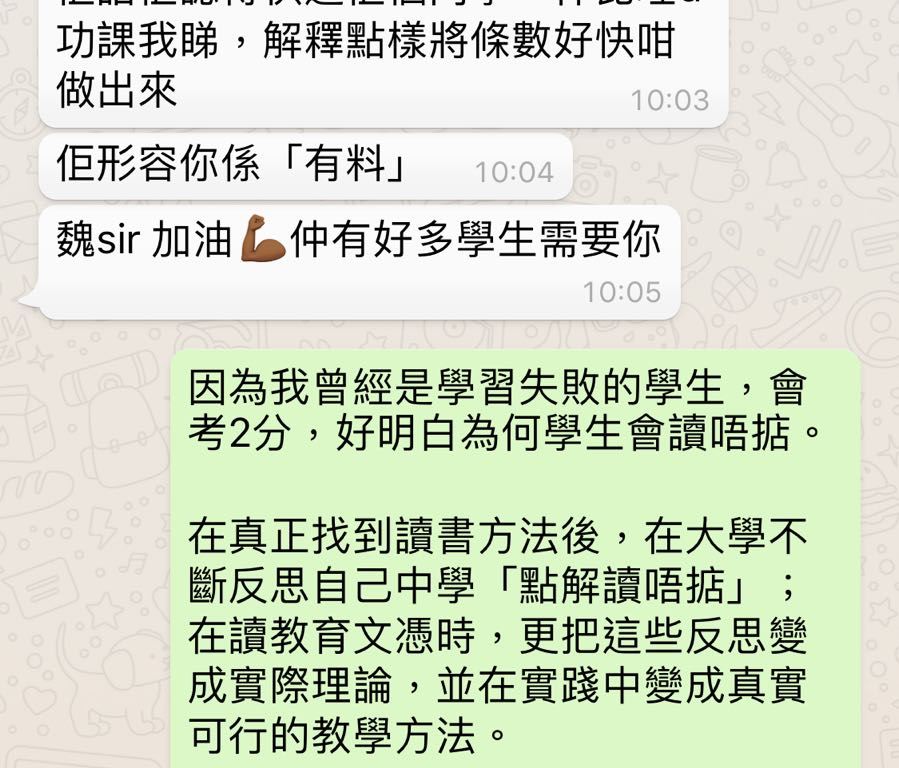 給家長的話,個案分享「你估佢真係想放棄學習咩?」 一位有明顯棄學情況的年青人,幾經轉折並在母親強拉的情況下來到學習啟航號。 第一次面談後,學生話可以試試; 第一次上課後,家長給我這個WhatsApp 。 「懶、hea、無興趣、放棄學習」都是學習問題出現後的表徵,而非學習失敗的原因。細心聆聽、耐心尋找,從隱藏的真正原因入手,棄學青年,也可重拾讀書樂趣。 「他們真的想放棄學習嗎?」 學習失敗?可能同小朋友無關。 #教書不如教讀書 分享此文: 分享到 X(在新視窗中開啟) X 分享到 Facebook(在新視窗中開啟) Facebook 喜歡 正在載入... 相關