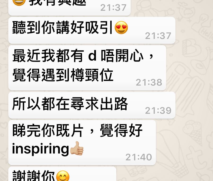 老師:「最近我在教學路上遇到瓶頸,很不開心,正在尋求出路,看畢你的影片後,令我感到鼓舞。」
