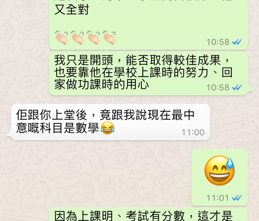家長:「自從他跟你上數學課後,竟然跟我說最喜歡的科目是數學科,甚至連功課也不需在家做,在學校已自行完成。」
