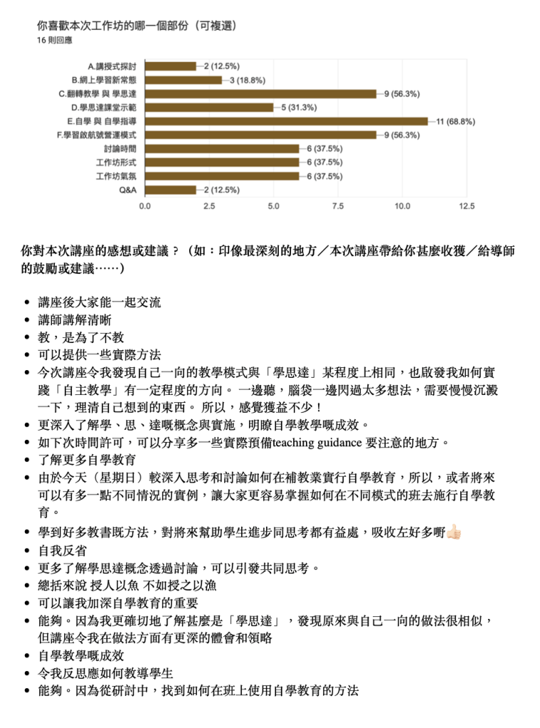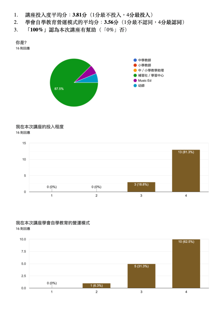 其他補教業講座_自學教育的營運模式_檢討數據 講座投入度平均分:3.81分(1分最不投入,4分最投入)學會自學教育營運模式的平均分:3.56分(1分最不認同,4分最認同)「100%」認為本次講座有幫助(「0%」否) 分享此文: 分享到 X(在新視窗中開啟) X 分享到 Facebook(在新視窗中開啟) Facebook 喜歡 正在載入... 相關