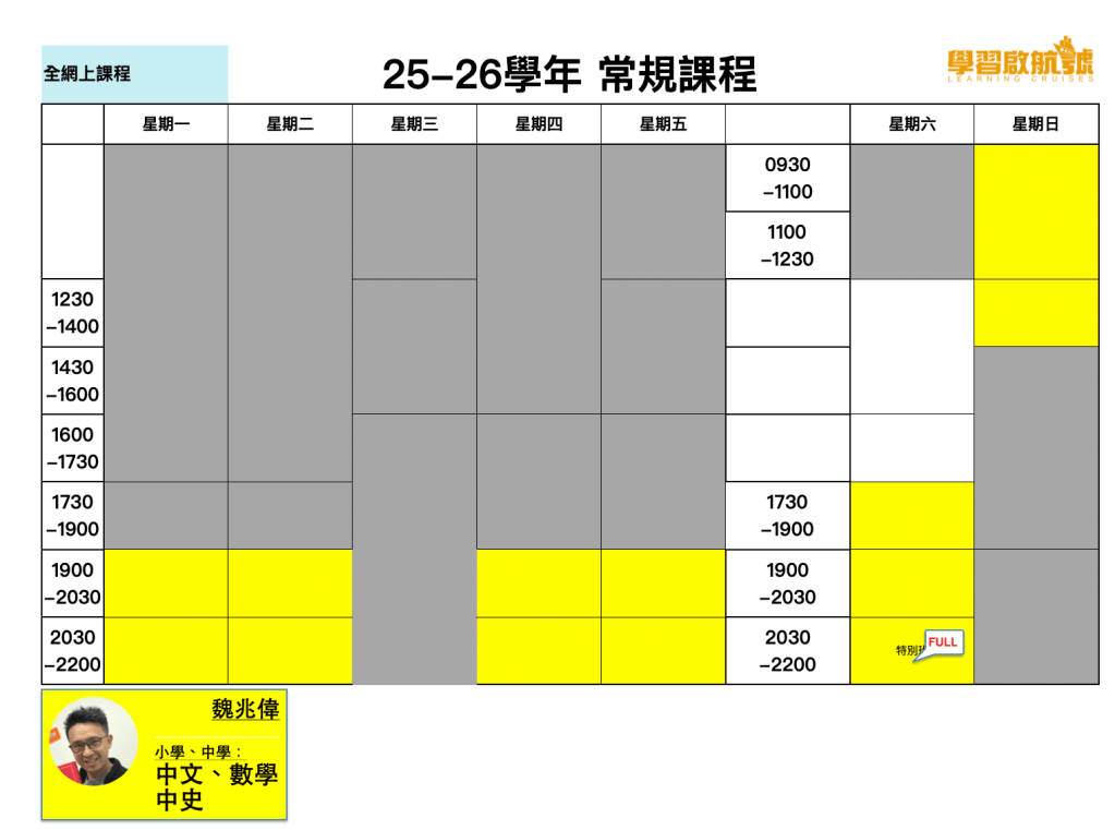 各種課程25-26學年常規網上課程(9月8日開始) 有關25-26學年常規網上課程。 報名方法: 手機報名:WhatsApp至97565969 (請註明「報讀課程、學員姓名和聯絡電話、家長姓名和聯絡電話」) 黃色區域的時間段都可以選擇,請報名時一併寫上你欲上課的時段。 例:數學專科班,逢周四2030-2200,S4魏兆偉,魏先生97565969。 分享此文: 按一下即可分享至 X(在新視窗中開啟) X 按一下以分享至 Facebook(在新視窗中開啟) Facebook 喜歡 正在載入... 相關